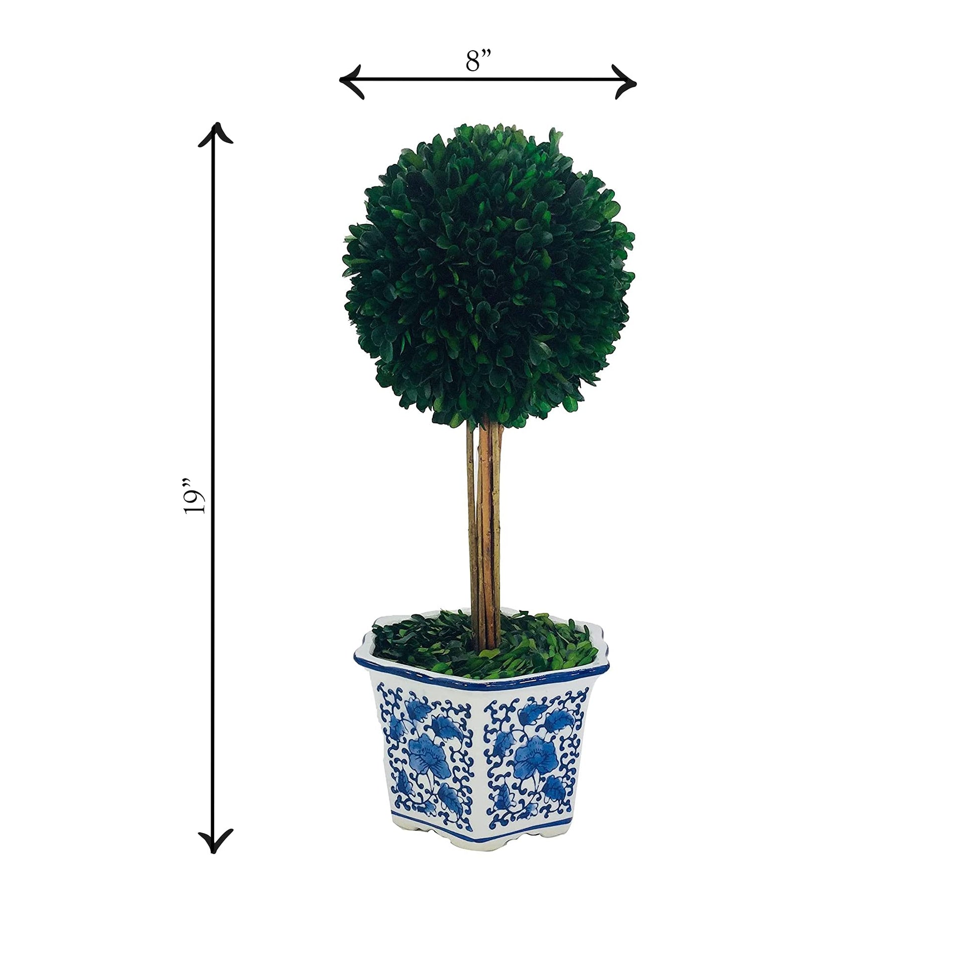 - CLASSIC HOME GREENERY: Our vibrant green preserved boxwood topiary tree comes in a greek-style blue and white ceramic pot with hand-painted floral designs, adding an elegant and fresh look to any room in your home! NOTE: Keep away from direct sunlight to prevent from fading or discoloration.